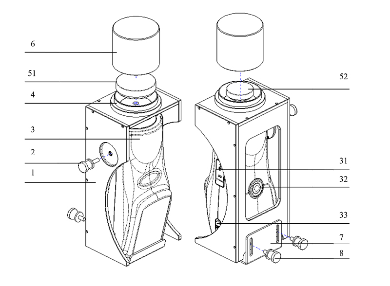 4、根据样品特点,选取适当容量的样品杯(Φ60mm样品杯51、Φ35mm样品杯52均可使用),将待测样品放入样品杯,然后将装有待测样品的样品杯的放入黑腔内,盖上黑腔盖板6,按照测色仪的测试方法进行色度数据测量。